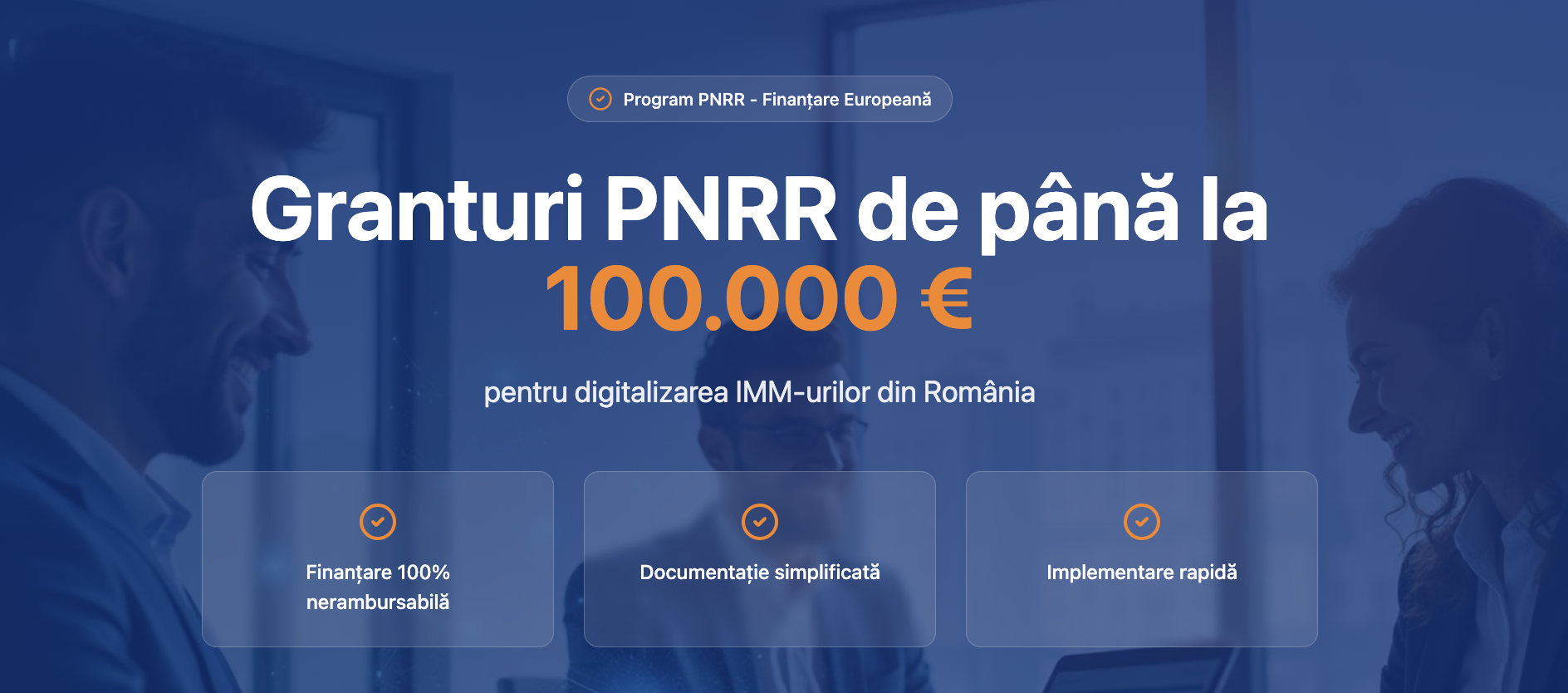 Programul Național de Modernizare a României (PNNR) oferă oportunități unice pentru companii de a-și digitaliza procesele de business și de a se alinia cu standardele globale. Una dintre aceste oportunități este grant-ul de până la 100.000 euro pe întreprindere destinat digitalizării IMM-urilor, aferent Investiției I3 din cadrul Componentei C9 a Planului Național de Redresare și Reziliență al României (PNRR).